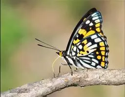 雌雄异型:雄蝶翅橙黄色,雌蝶暗灰色至灰橙色,黑斑较雄蝶发达。雄蝶前翅有4条粗长的黑褐色性标,分布在M3、Cu1、Cu2、2A脉上,中室内有4条短纹,翅端部有3列黑色圆斑,后翅基部灰色,又1条不规则波状中横线及3列圆斑。反面前翅顶端部灰绿色,有波状中横线及3列圆斑,黑斑比正面大;后翅灰绿色,有金属光泽,无黑斑,亚缘又白色线及眼状纹,中部至基部有3条白色斜带。