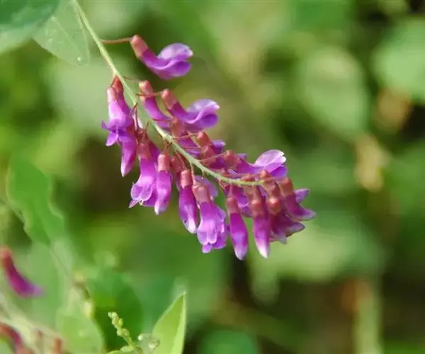 多年生攀援性草本,高50-100厘米。根状茎粗灶,分歧。茎有棱,稍被细柔毛或近无毛。叶为偶数羽状复叶,具3-5对小叶,茎上部叶常具1-2对小叶,叶轴末端为分歧或单一的卷须;找叶半箭头形,通常具1至数个锯齿,长10-15(25)毫米,有时长10毫米以下;小叶卵形或椭圆形,近革质,长(2) 3-6(10)厘米,宽(8)13-25(35)毫米,基部圆形或广楔形,先端钝,有时稍锐尖或渐尖,全缘,表面通常无毛,背面稍有毛或无毛,侧脉不达边缘,在末端互相连合成为波状或牙齿状。总状花序腋生,有时花轴稍分枝构成复总状花序,多边缘花;花梗有毛;萼钟状,萼齿短,三角形,先端常呈锥状;花冠紫色或蓝紫色,长10-14毫米,旗瓣瓣片比瓣爪稍短或近等长,翼瓣及龙骨瓣与旗瓣近等长。荚果长圆形,扁平或稍扁,先端斜楔形,无毛,具1-4(6)粒种子。花期7-9月,果期8-10月。