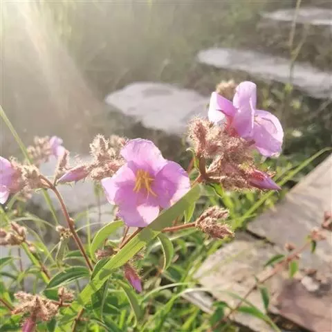 稀疏的聚伞花序组成圆锥花序,顶生,长7-22厘米或更长;花萼长约2.3厘米,外面除被多轮的刺毛状有柄星状毛外,尚密被微柔毛,裂片4,长三角形或卵状三角形,长约1.1厘米;花瓣深红色至紫色,卵形,长约2厘米;雄蕊8,花药具长喙,药隔基部微膨大,末端具刺毛2;子房顶端具1圈短刚毛,上半部被疏微柔毛。