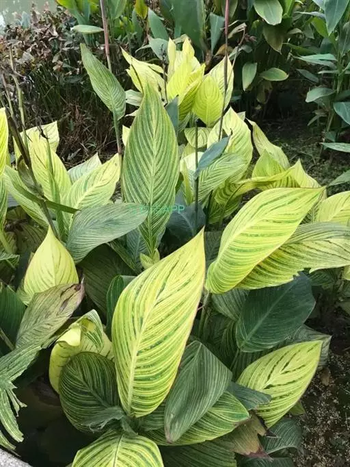 金脉美人蕉叶片淡黄色,叶脉绿化,叶缘具红边,全缘,大花美人蕉之变种