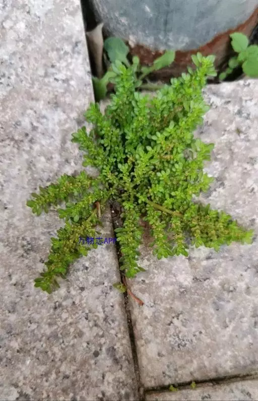 纤细小草本,无毛,铺散或直立。茎肉质,多分枝,高3-17厘米,粗1-1.5毫米,干时常变蓝绿色,密布条形钟乳体。叶很小,同对的不等大,倒卵形至匙形,长3-7毫米,宽1.5-3毫米,先端钝,基部楔形或渐狭,边缘全缘,稍反曲,上面绿色,下面浅绿色,干时呈细蜂巢状,钟乳体条形,上面明显,长0.3-0.4毫米,横向排列,整齐,叶脉羽状,中脉稍明显,在近先端消失,侧脉数对,不明显;叶柄纤细,长1-4毫米;托叶不明显,三角形,长约0.5毫米。