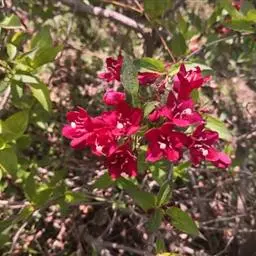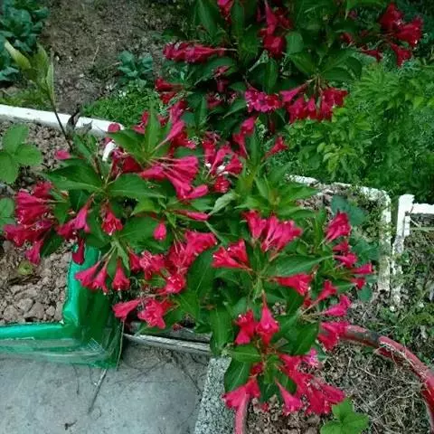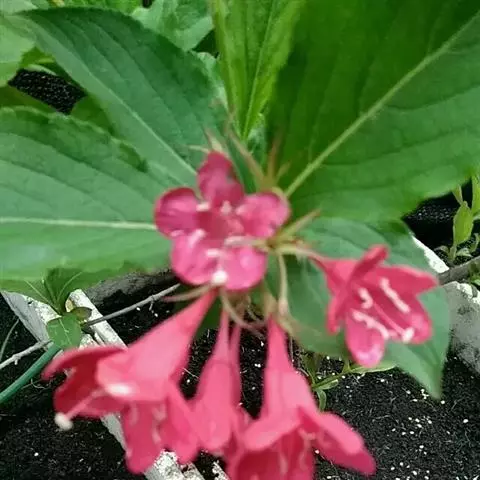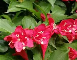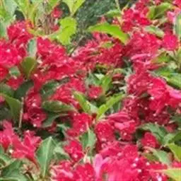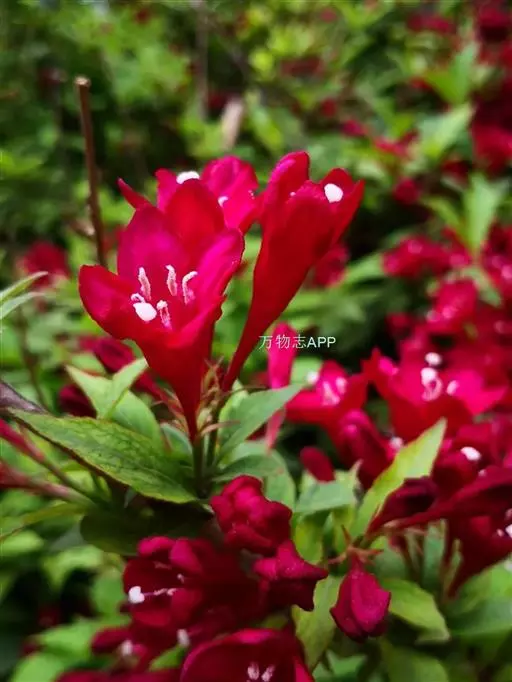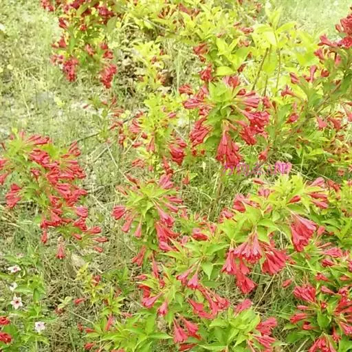 8.红王子锦带花:其植株较矮,株高1米至2米,冠幅1.4 m。嫩枝淡红色,老枝灰褐色。叶长椭圆形,整个生长季叶片为金黄色。夏初开花,花期自4月陆续开到10月 份,枝条开展成拱形。聚伞花序生于叶腋或枝顶,花冠漏斗状钟形,花朵密集,花冠胭脂红色,艳丽悦目。