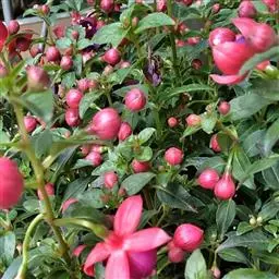 倒挂金钟(拉丁学名:Fuchsia hybrida hort. ex Sieb. et Voss ),别名:灯笼花、吊钟海棠。多年生半灌木,茎直立。高50-200厘米,粗6-20毫米,多分枝,被短柔毛与腺毛,老时渐变无毛,幼枝带红色。叶对生,卵形或狭卵形,长3-9厘米,宽2.5-5厘米。喜凉爽湿润环境,怕高温和强光,以肥沃、疏松的微酸性壤土为宜,冬季温度不低于5℃。