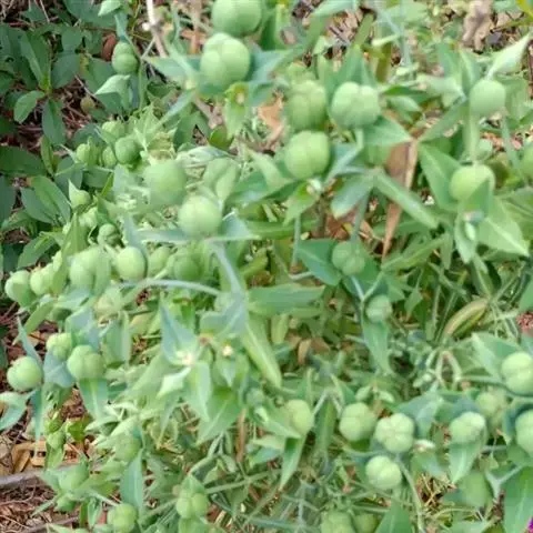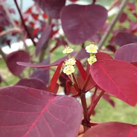总苞陀螺状,高约2毫米,直径约1.5毫米,内侧被短柔毛;腺体5枚,盾状卵形或近圆形。雄花数枚,伸出总苞之外;雌花1枚,子房柄伸出总苞边缘;子房光滑无毛;花柱3,中部以下合生;柱头2裂。蒴果棱状三角形,长度与直径均约8毫米,平滑,略被毛或无毛。种子卵球状,长与直径均约4毫米,平滑;具微小的种阜。花果期7~10月。白色乳汁有剧毒,需特别谨慎以免中毒。