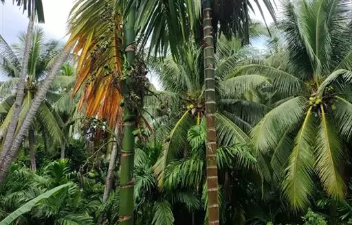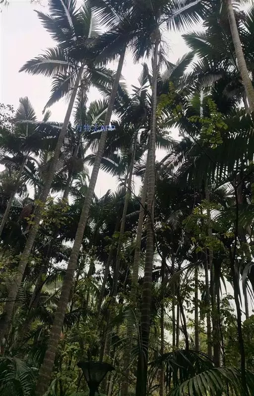 热带雨林温室的槟榔树 种子处理:由于槟榔种子有1个后熟期,采收后应将槟榔种子摊晒5-7天,果皮略干,使其完全成熟后再进行催芽。用编织袋将晒好的槟榔种子装入编织袋中,放在阴凉处,每天早上或晚上浇水1次,连续15-20天,待果皮松软,用清水冲洗干净后接着催芽。