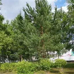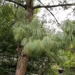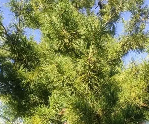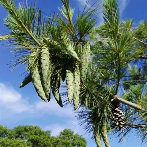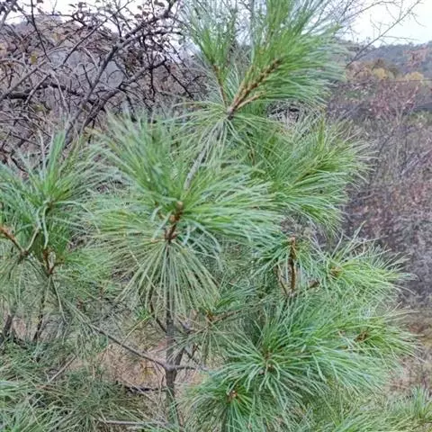 华山松是乔木,高达35米,胸径1米;幼树树皮灰绿色或淡灰色,平滑,老则呈灰色,裂成方形或长方形厚块片固着于树干上,或脱落;枝条平展,形成圆锥形或柱状塔形树冠;一年生枝绿色或灰绿色(干后褐色),无毛,微被白粉;冬芽近圆柱形,褐色,微具树脂,芽鳞排列疏松。