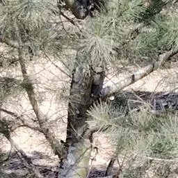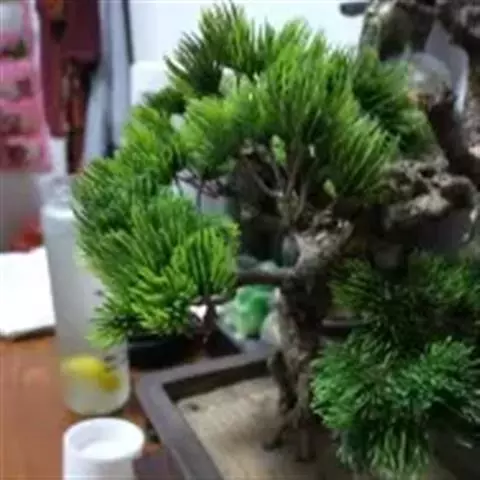 三、整姿技术 加工:华山松的加工造型可以攀扎为主,修剪为辅。攀扎用金属丝或棕丝。华山松枝条较为柔软,用金属丝攀扎简便易行,屈伸自如。如取2~3年生幼树苗为材料,将主干作一定的弯曲,剪去碍于造型的枝干,再将保留的侧枝攀扎成水平状或略下垂状,生长一年后再拆除金属丝,重新调整角度,再行攀扎,数年后即可成型。