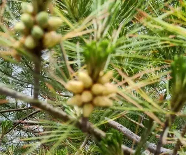 雄球花黄色,卵状圆柱形,长约1.4厘米,基部围有近10枚卵状匙形的鳞片,多数集生于新枝下部成穗状,排列较疏松。