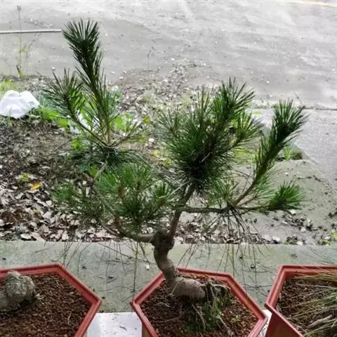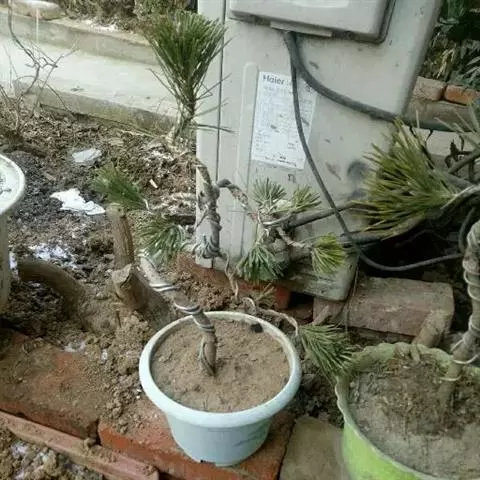 二、上盆过程 选盆:华山松宜用紫砂陶盆,也可用釉陶盆。刚上盆栽培,可先用透气性良好的素烧瓦盆,待服盆后再换入形态优雅的紫砂浅盆中。除悬崖式用深千筒盆或较深的四方和圆形盆外,一般以长方形中浅盆为宜。盆的形态也可依树形而定,如曲干式可用鼓形浅圆盆,盆色选紫红或浅黄均可。
