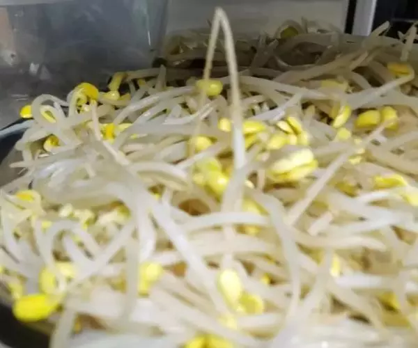 ②浸豆、催芽:先加入与豆粒等量的温水浸种,并上下翻动数次使之均匀。8-12小时后种壳涨裂,将余水淋去,装入桶内催芽。在25-30℃下,经12小时,芽长1cm转入豆芽桶内淋水培育。