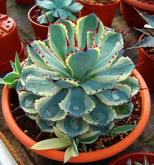 雷神又名棱叶龙舌兰,是天门冬科龙舌兰属的多年生常绿植物。植株矮小,株高6~8厘米,株幅8~10厘米。叶片短而宽,叶缘有稀疏肉齿,齿端生黄色或红色短刺,叶顶端有1枚短刺。原产墨西哥中南部。喜温暖干燥和阳光充足环境。适应性强,较耐寒,略耐阴,怕水涝。以排水良好、肥沃的沙壤土为好。冬季温度不低于4℃。常见园艺品种有:雷神,王妃雷神,雷神锦。