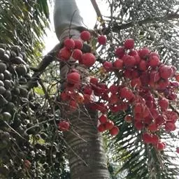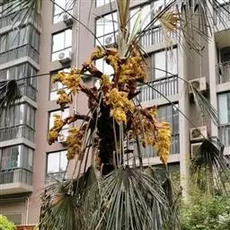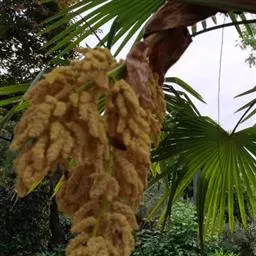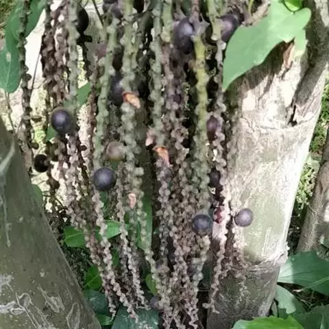 花序生于叶鞘之下,呈圆锥花序式,长约0.8米,具2-3次分枝,分枝花序长20-30厘米,其上有8-10个小穗轴,长12-18厘米;花小,卵球形,金黄色,螺旋状着生于小穗轴上;雄花萼片和花瓣各3片,上面具条纹脉,雄蕊6,花药多少丁字着;雌花萼片和花瓣与雄花的略同,子房1室,具短的花柱和粗的柱头。