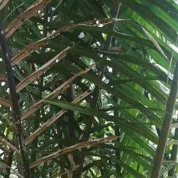 作为切叶栽培的散尾葵,连续采叶2 年后,须对植株进行全面地复壮以及必要的设备维护。主要是遮光设备的维护,因为随着植株的不断生长,遮光设备满足不了植株生长高度的要求,在台风季节, 很容易把荫网弄破。其次是植株的复壮。因为主干明显的生长优势,影响了侧芽的生长,造成产量下降;还有植株的不断分蘖,使株型过大,造成生长空间不够、光线不足、营养跟不上,最终使叶片质量大幅下降。措施是对植株进行全面地复壮修剪和去劣存优, 主要是把过高、过大的主干在离土表30-40厘米处锯掉, 将一些病枝、弱枝剪去;株型太大的可实行分株分丛, 留下6-10个健壮枝条重新种下, 培好土, 淋足定根水。
