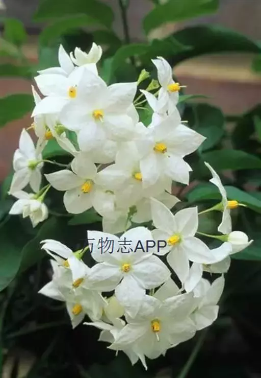 素馨叶白英(学名Solanum jasmioides Paxt.),是双子叶植物纲、茄科、茄属的一种缠绕灌木,多分枝,光滑无毛,茎具纵向细条纹。聚伞式圆锥花序顶生或侧生;花白带蓝色;萼星形,萼齿长圆形;花冠辐形,具皱折;雄蕊着生于花冠筒喉部,花药黄色,子房长圆形。原产于巴西,中国浙江农学院曾引种栽培。它可用作藤蔓花卉。