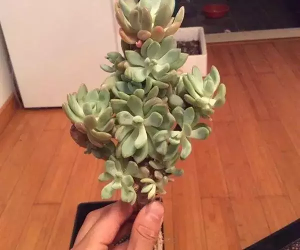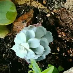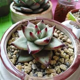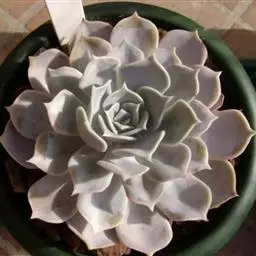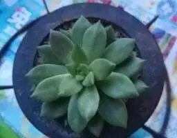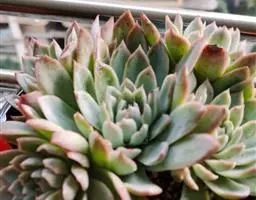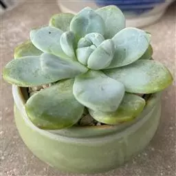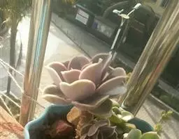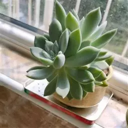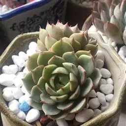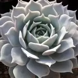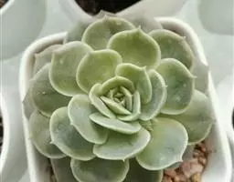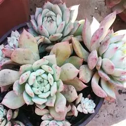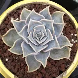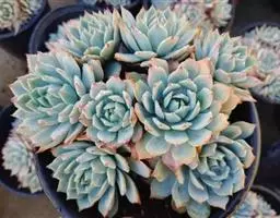 立田锦多肉(Echeveria Pachyveria ‘Albocarinata’),易群生的景天科拟石莲花属和厚叶草属杂交多肉品种。茎直立,株高30厘米以内,其叶排列呈莲座状,叶片直立,被白霜,肉质,披针形,长匙形,先端近无尖或具不明显的短叶尖,叶片中绿色,被白粉后外观呈近白色,在较低的温度下叶缘呈粉红色。
