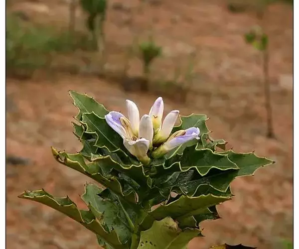 穗状花序顶生;苞片对生,宽卵形,长7-8毫米,无刺,早落;小苞片卵形,长约5毫米,革质;花萼裂片4,外方的1对宽卵形,长10-13毫米,顶端微缺,边缘质薄,有时成皱波状,具缘毛,内方的1对卵形,长约10毫米,全缘。花冠白色,长3-4厘米,花冠管长约6毫米,上唇退化,下唇倒卵形,长约3厘米,薄革质,顶端3裂,外面被柔毛,内面上部两侧各有1条3-4毫米宽的被毛带;雄蕊4,近等长,花药1室,纵裂,裂缝两侧各有1列髯毛,花丝粗厚,长1.5厘米,最宽处约2毫米,近软骨质;子房顶部软骨质,花柱有纵纹,长2.2厘米;柱头2裂。蒴果椭圆形,长2.5-3厘米,有种子4颗。种子扁平,圆肾形,淡黄色。