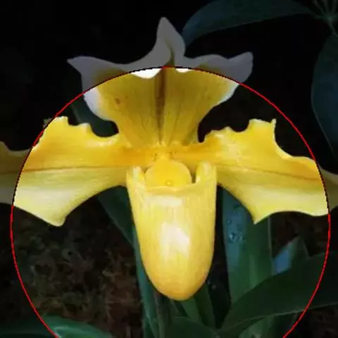 花葶直立,长16-22厘米,绿色,密生褐色或紫褐色毛,顶端生1花;花苞片近椭圆形,绿色,围抱子房,长2-2.6厘米,宽6-12毫米,先端钝,背面被栗色微柔毛,尤以近基部及中脉上为多;花梗和子房长3-4厘米,密被紫褐色短柔毛;花直径约6厘米;中萼片奶油黄色或近绿色,有许多不规则的紫褐色粗斑点,合萼片色泽相近但无斑点或具少数斑点,花瓣玫瑰红色,基部有紫褐色粗斑点,唇瓣亦玫瑰红色并略有黄白色晕与边缘;中萼片近圆形或扁圆形,长3-3.4厘米,宽3-3.8厘米,先端钝或略具短尖,上半部边缘略波状,背面被微柔毛;合萼片较狭窄,长2.7-3.5厘米,宽1.4-1.6厘米,背面亦被微柔毛;花瓣狭倒卵状椭圆形至近长圆形,长3.2-3.6厘米,宽1.4-1.6厘米,边缘多少波状,先端有不甚明显的3小齿,内表面基部偶见疏柔毛,边缘有缘毛;唇瓣倒盔状,基部具宽阔的、长约1.5厘米的柄;囊近宽椭圆形,长2.3-2.5厘米,宽约2.5厘米,囊口极宽阔,两侧各具1个直立的耳,两耳前方边缘不内折,囊底有毛;退化雄蕊倒心形至宽倒卵形,长6-7毫米,宽7-8毫米,基部有耳,上面中央具1枚齿状突起。 花期7-8月。