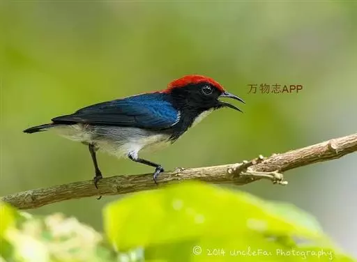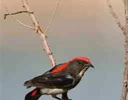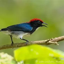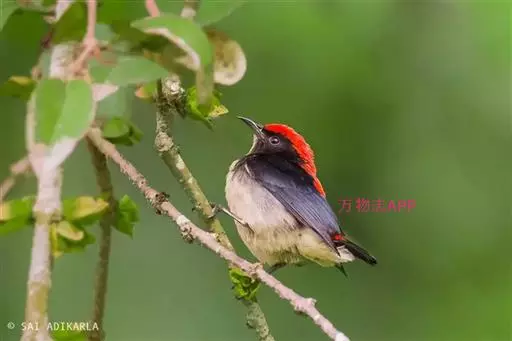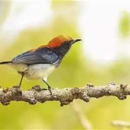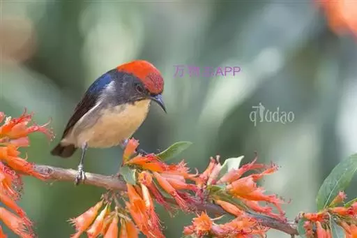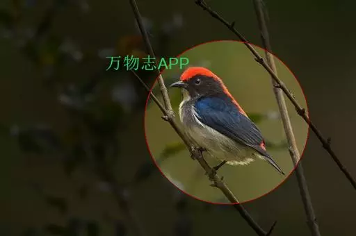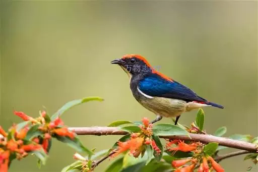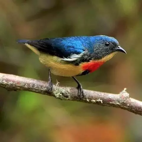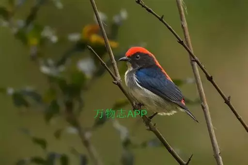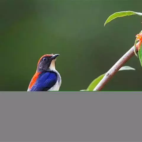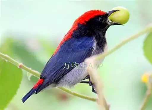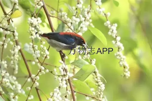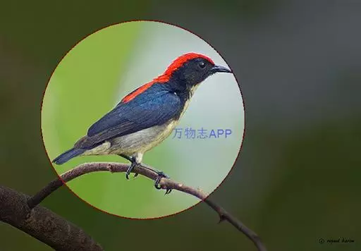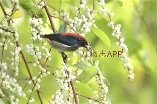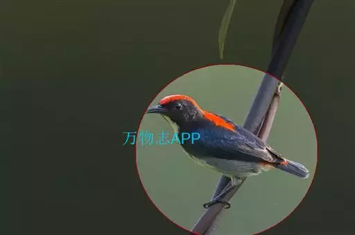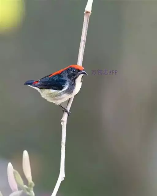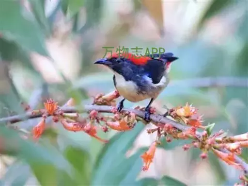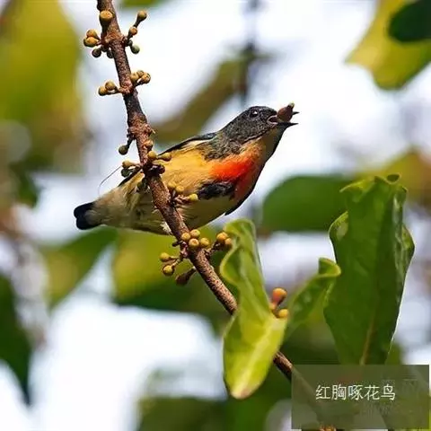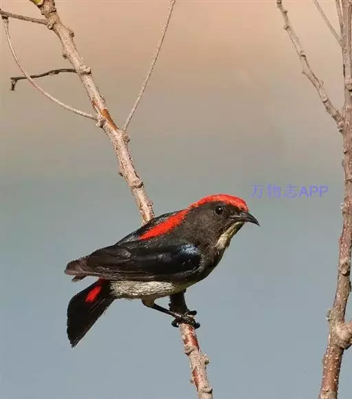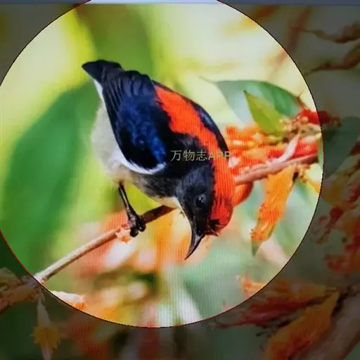 朱背啄花鸟(学名:Dicaeum cruentatum):体重6-8克,体长81-97毫米。是一种小型的黑色及红色啄花鸟。雄鸟顶冠、背及腰猩红色,两翼、头侧及尾黑,两胁灰,下体余部白色。雌鸟上体橄榄色,腰及尾上覆羽猩红,尾黑。亚成鸟清灰色,嘴橘黄,腰略沾暗橘黄色。虹膜褐色,嘴黑绿,脚黑绿。