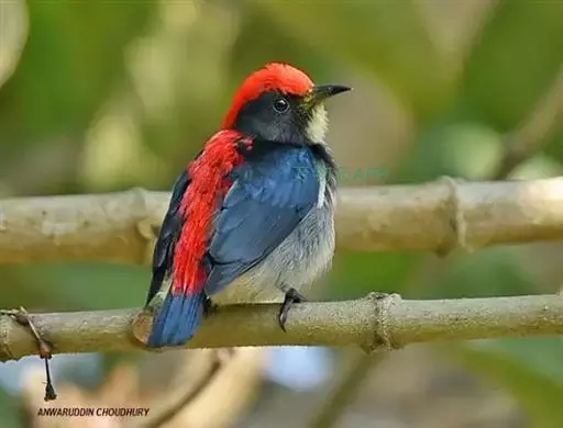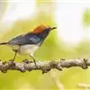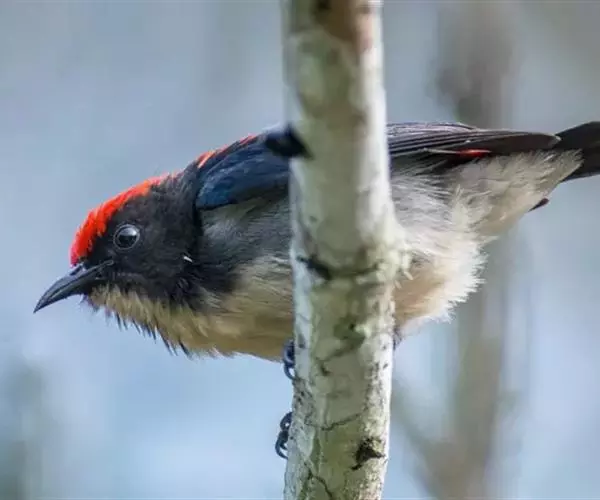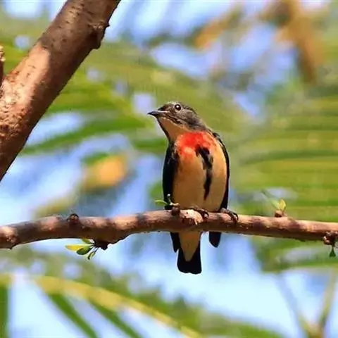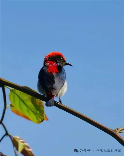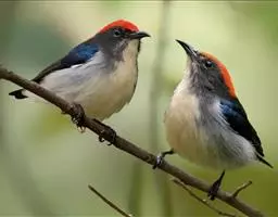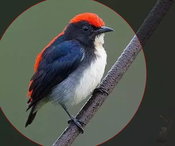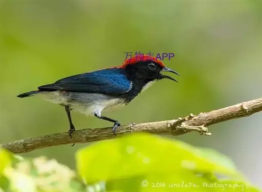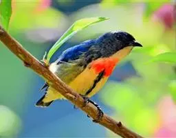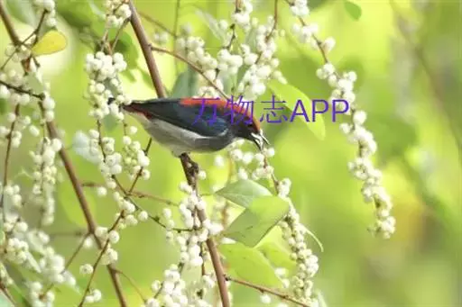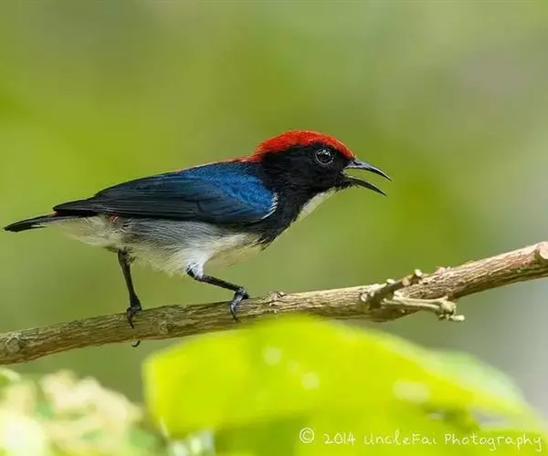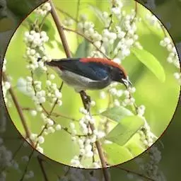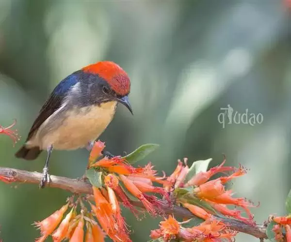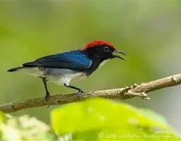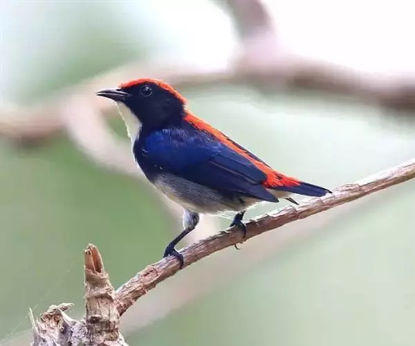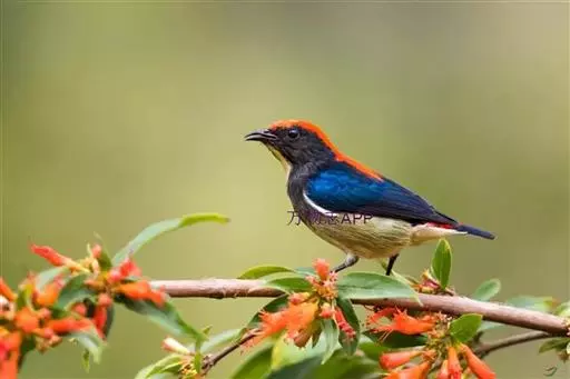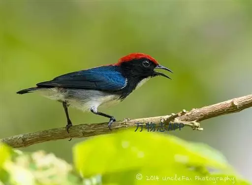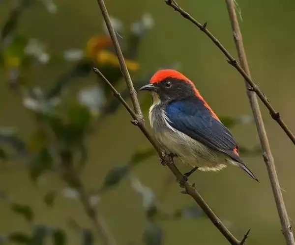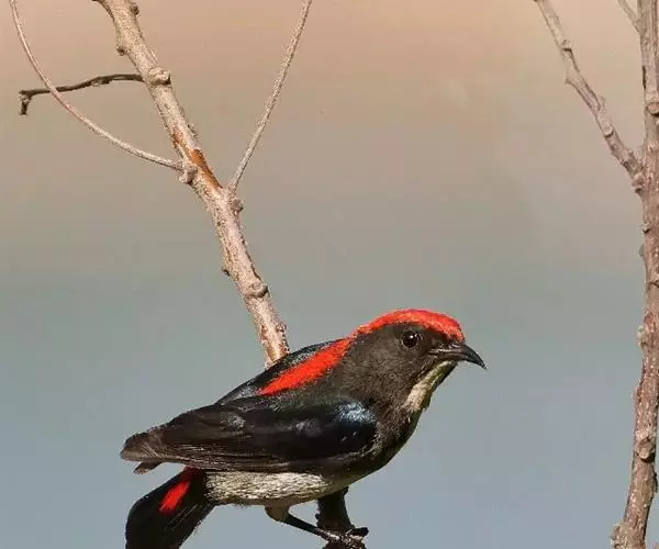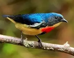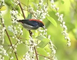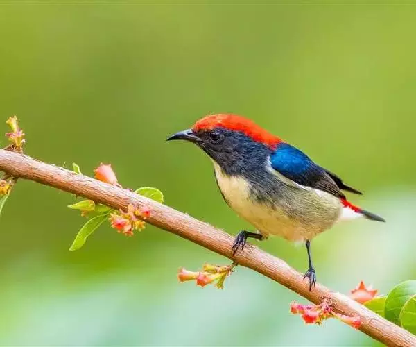 朱背啄花鸟(学名:Dicaeum cruentatum):体重6-8克,体长81-97毫米。是一种小型的黑色及红色啄花鸟。雄鸟顶冠、背及腰猩红色,两翼、头侧及尾黑,两胁灰,下体余部白色。雌鸟上体橄榄色,腰及尾上覆羽猩红,尾黑。亚成鸟清灰色,嘴橘黄,腰略沾暗橘黄色。虹膜褐色,嘴黑绿,脚黑绿。