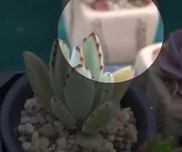 褐斑伽蓝为多年生多肉类植物,叶片奇特,形似兔耳,植株密被绒毛,叶片边缘着生褐色斑纹,植株为直立的肉质灌木,容易长高,中型品种。植株叶片对生,长梭型,整个叶片及茎干密布凌乱绒毛,新叶金黄色,老叶片颜色微微黄褐色,叶尖圆型,植株的叶片非常可爱,月兔耳和黑兔耳的区别是月兔耳的叶片边缘不容易发黑,黑兔耳的叶片边缘容易发黑。初夏开花,聚伞花序,花序较高,小花管状向上,花开白粉色,花瓣4片,花期较长。