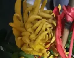 果形和果实大小都不整的,果梗部似三宝柑,有突起短颈,也有完全无短颈的,无颈的扁平果顶多有脐。果皮黄橙色,10月中旬开始着色,12月上旬完全着色。果皮黄橙色,厚3.5-5mm。成熟果果皮略粗。易剥皮,有碰柑香味,无浮皮。