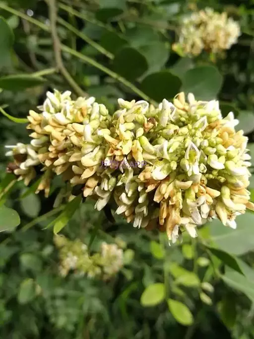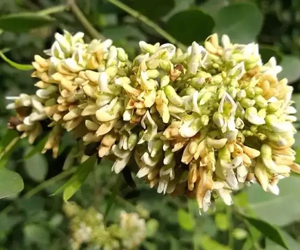 聚伞状圆锥花序生于上部叶腋,长约15厘米,径约7.5厘米;总花梗与分枝被微柔毛;花稍密集,具短梗;小苞片卵形,膜质,脱落;花萼钟状,外面疏被柔毛,萼齿5,具缘毛,最下1枚较长,长圆形,约与萼筒等长,先端圆钝,其余的近等长,上方2枚近合生;花冠白色,旗瓣阔倒卵状长圆形,先端稍凹缺,基部具阔短瓣柄,翼瓣狭倒卵状长圆形,无耳,龙骨瓣近半月形,内侧基部有短耳,与翼瓣同具狭长的瓣柄;雄蕊9,单体,花丝离生部分长短相间;子房无毛或沿缝线被微柔毛,具长柄,有胚珠2-3粒,花柱短,柱头头状。