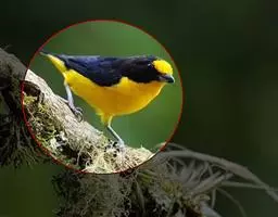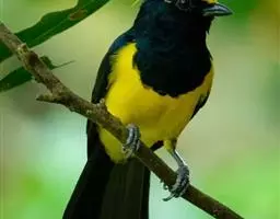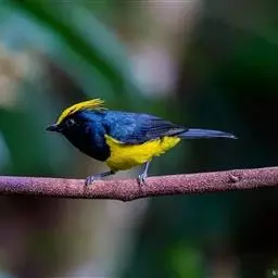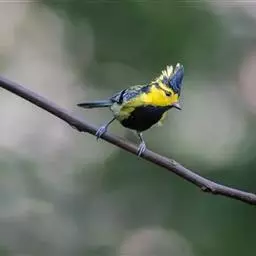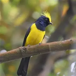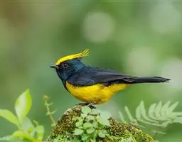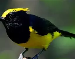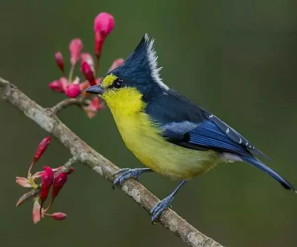雌雄羽色相似。额基、眼先、脸、颊鲜黄色,额、头顶至后颈黑色,羽冠亦为黑色,后部冠羽末端和后颈中央白色。背、肩、腰和尾上覆羽绿色具蓝黑色金属光泽。尾暗蓝色或黑色,羽缘蓝灰色,外侧尾羽外翈白色。两翅黑色,羽缘亦为蓝灰色,内侧飞羽具白色尖端。颏、喉、颈侧、胸、腹等下体鲜黄色,两胁沾橄榄色,尾下覆羽白色。雄鸟肛周黑色,在腹部形成一块黑斑。