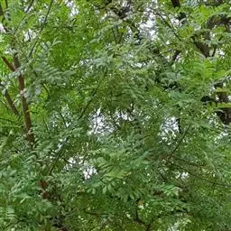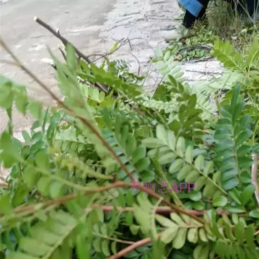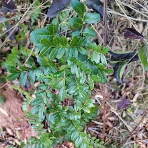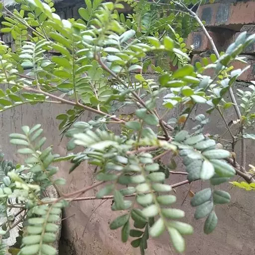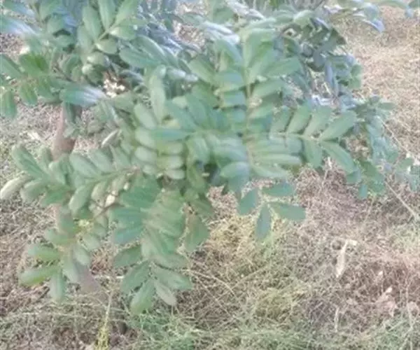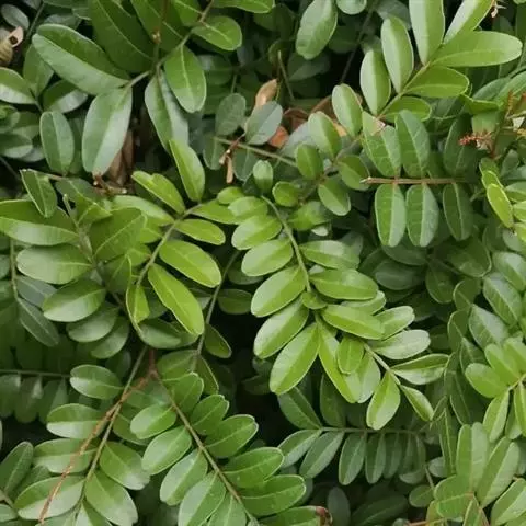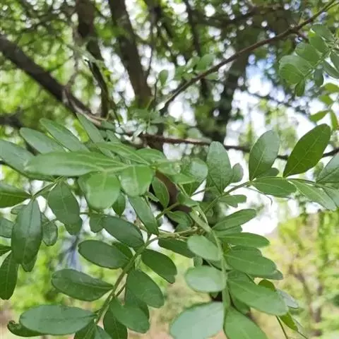 偶数羽状复叶互生,有小叶4-9对,叶轴具狭翅,上面具槽,被灰色微柔毛,叶柄被微柔毛。小叶革质,长圆形或倒卵状长圆形,较小,长1.3-3.5厘米,宽0.8-1.5厘米,稀较大(5×1.8厘米);先端微缺,具芒刺状硬尖头,基部略不对称,阔楔形;全缘,略背卷,两面中脉上被极细微柔毛,侧脉在叶面微凹,在叶背明显突起;小叶柄极短。