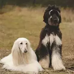 阿富汗猎犬全身披丝绢状的长毛,毛色鲜艳,呈多种颜色,背中线附近毛短,…