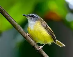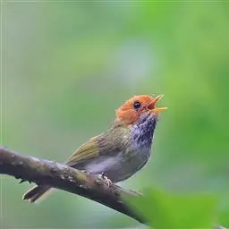 棕脸鹟莺:体长10厘米,是一种色彩亮丽而有特色的莺鸟。头栗色,具黑色侧冠纹。上体绿,腰黄色。下体白,…