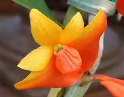 独角石斛,Dendrobium unicum,兰科石斛属植物。花瓣橙黄色,唇瓣反转似犀牛角,…