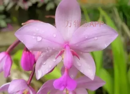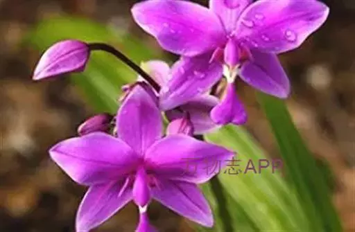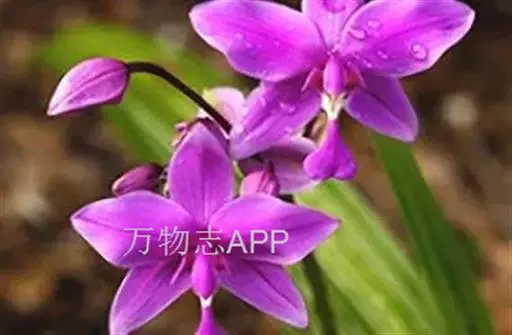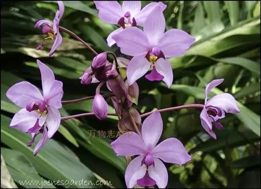 紫花苞舌兰(学名:Spathoglottis plicata Bl.):植株高达1米。假鳞茎卵状圆锥形,具3-5枚叶。叶质地薄,淡绿色,狭长,具折扇状的脉。花葶长达1米,下部具数枚筒状鞘;总状花序短,具约10朵花;花紫色;花瓣近椭圆形,比萼片大,先端锐尖;唇瓣贴生于蕊柱基部,长约1.5厘米,3裂。花期常在夏季。