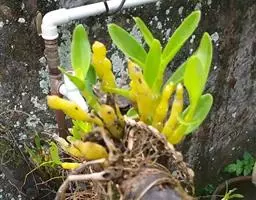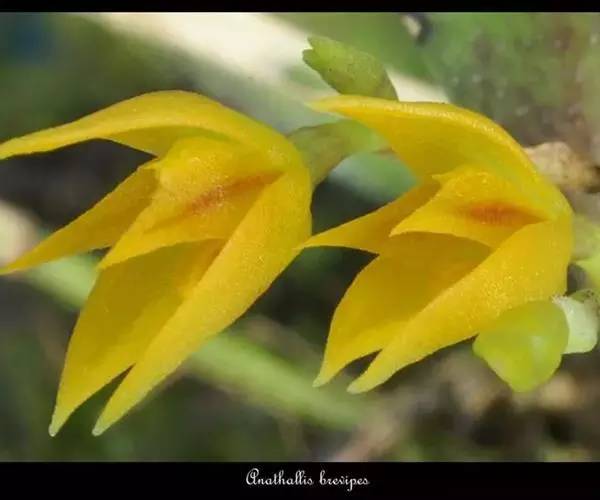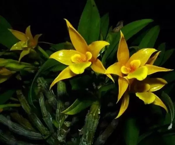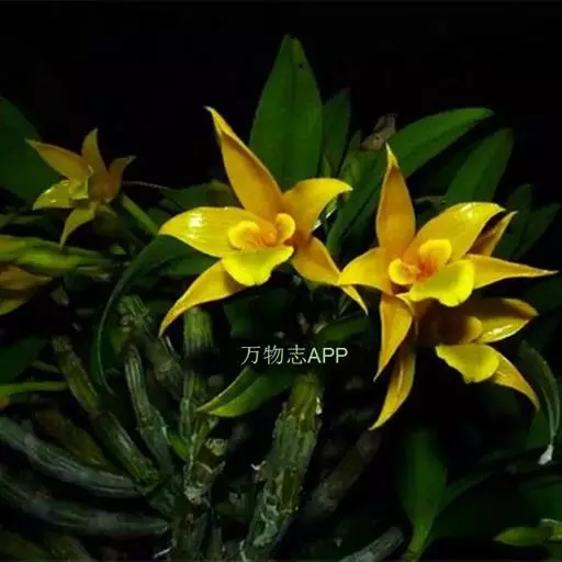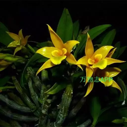 翅梗石斛(学名:Dendrobium trigonopus Rchb. f.):茎丛生,肉质状粗厚,呈纺锤形或有时棒状,不分枝,具3-5节,干后金黄色。叶厚革质,3-4枚近顶生,长圆形。总状花序出自具叶的茎中部或近顶端,常具2朵花,花下垂,不甚开展,质地厚,除唇盘稍带浅绿色外,均为蜡黄色;花瓣卵状长圆形,长约2.5厘米,宽1.1厘米,先端急尖,具8条脉;唇瓣直立,与蕊柱近平行,长2.5厘米,基部具短爪,3裂。花期3-4月。