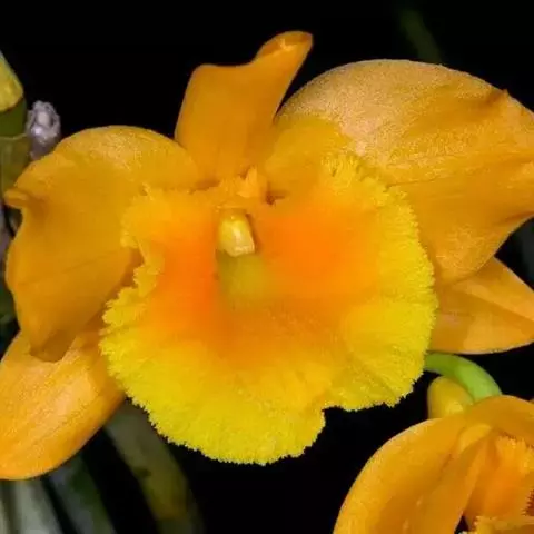 独角石斛,Dendrobium unicum,兰科石斛属植物。花瓣橙黄色,唇瓣反转似犀牛角,…