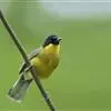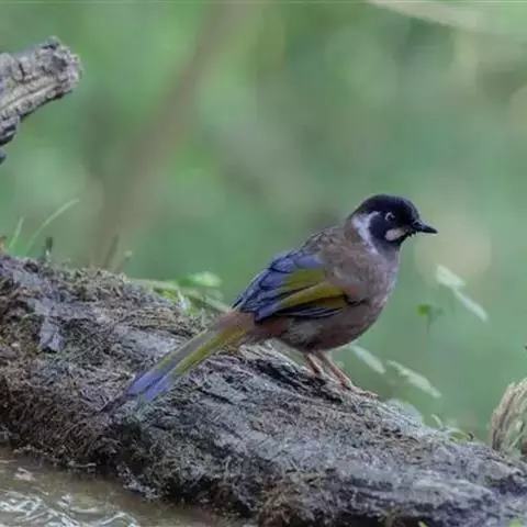 黄喉噪鹛体型略小,顶冠蓝灰色,特征为具黑色的眼罩和鲜黄色的喉。上体褐色,尾端黑色而具白色边缘,…