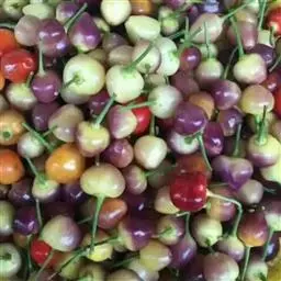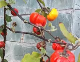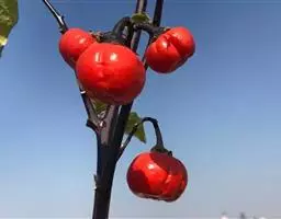 浆果红色或在栽培类型中也有橙色,果皮肉质,多汁液,形状及大小由于经长期人工培育或植株年龄、生境的不同而多变,广椭圆状、矩圆状、卵状或近球状,顶端有短尖头或平截、有时稍凹陷,长8-20毫米,直径5-10毫米。种子常20余粒,略成肾脏形,扁压,棕黄色,长约2毫米。花果期较长,一般从5月到10月边开花边结果,采摘果实时成熟一批采摘一批。