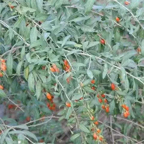 宁夏枸杞,作者:刘赛 宁夏枸杞为灌木,或栽培因人工整枝而成大灌木,高0.8-2米,栽培者茎粗直径达10-20厘米;分枝细密,野生时多开展而略斜升或弓曲,栽培时小枝弓曲而树冠多呈圆形,有纵棱纹,灰白色或灰黄色,无毛而微有光泽,有不生叶的短棘刺和生叶、花的长棘刺。叶互生或簇生,披针形或长椭圆状披针形,顶端短渐尖或急尖,基部楔形,长2-3厘米,宽4-6毫米,栽培时长达12厘米,宽1.5-2厘米,略带肉质,叶脉不明显。