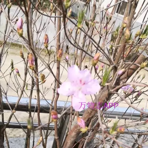 兴安杜鹃(学名:Rhododendron dauricum L.)是杜鹃花科,杜鹃花属半常绿灌木,高可达2米,分枝多。叶片近革质,椭圆形或长圆形,两端钝,上面深绿,下面淡绿,叶柄被微柔毛。花序腋生枝顶或假顶生,伞形着生花先叶开放,花冠宽漏斗状,粉红色或紫红色,花药、花柱紫红色,蒴果长圆形,5-6月开花,7月结果。