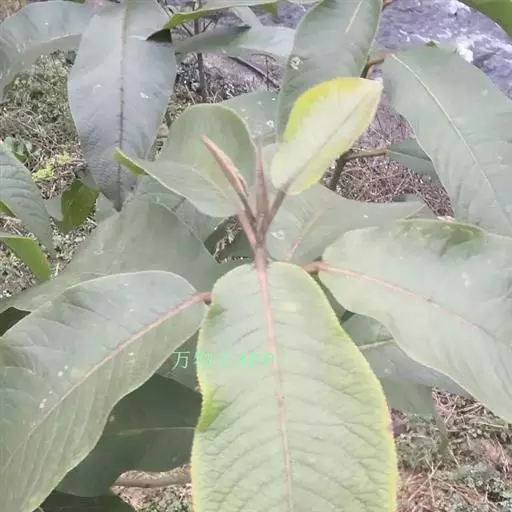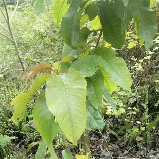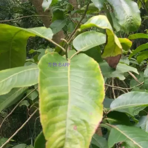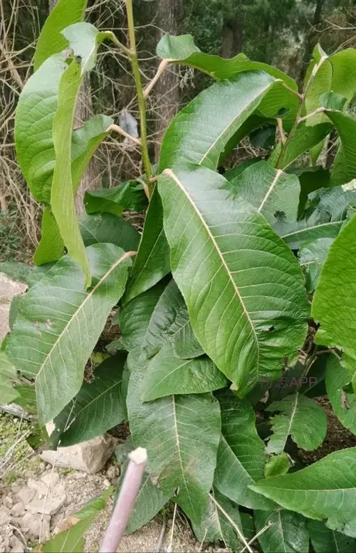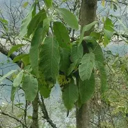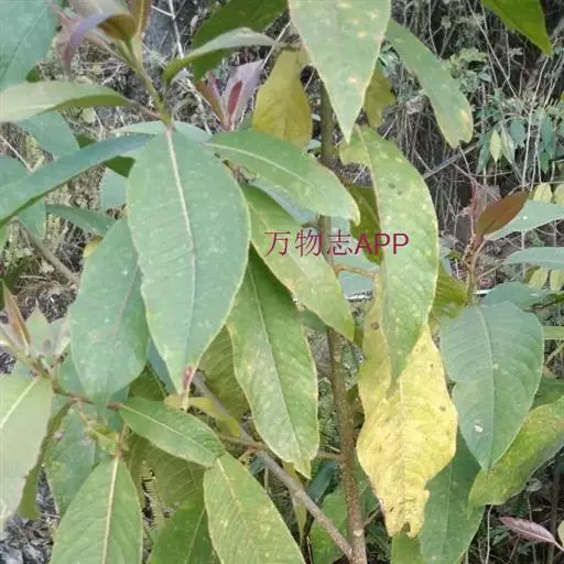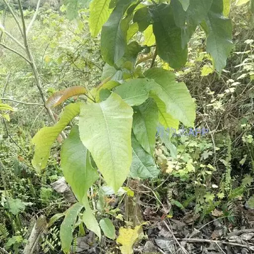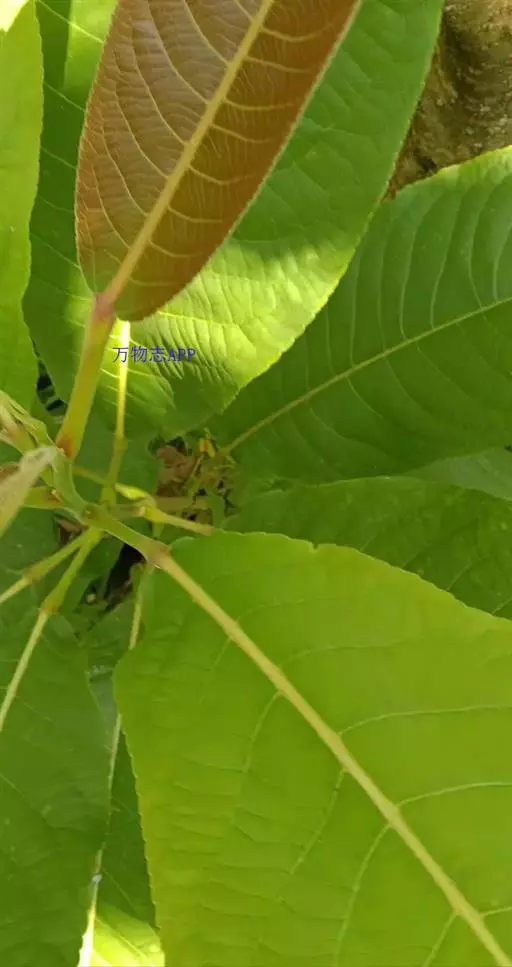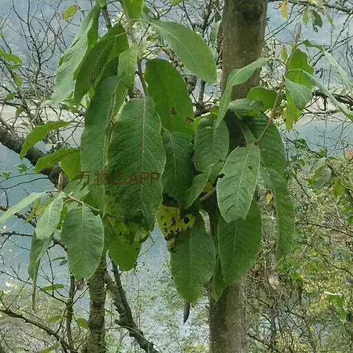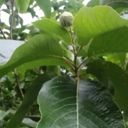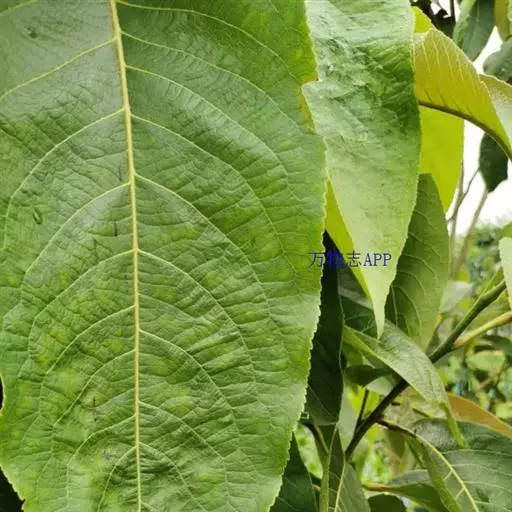 叶大型,薄革质,椭圆形或卵状长圆形或长圆状倒卵形,长13-40厘米,宽6-14厘米,先端锐尖或渐尖,基部钝或近圆形,边缘有钝齿,上面深绿色,脉上有疏毛,下面淡绿色,密生短柔毛,中脉在上面稍凹,在下面突起,羽脉 10-26对;叶柄长3-6厘米,上面扁平,下面圆形,有柔毛。