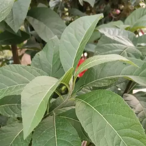 下部茎叶花期脱落或生存;中部茎叶卵形、菱状卵形或匙形或近圆形,长2.5-6厘米,宽2-4厘米,顶端渐尖,基部截形、楔形或圆形,边缘有不规则的粗锯齿,两面被稀疏的短硬毛,叶柄长2-4厘米,被白色短硬毛,有狭翼;上部的茎叶渐小,菱状披针形,长椭圆形或倒披针形,边缘有1-2个锯齿,或线形而全缘。