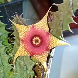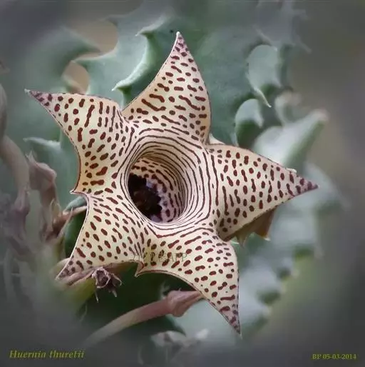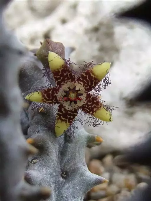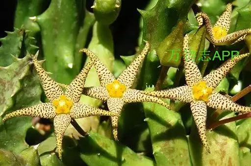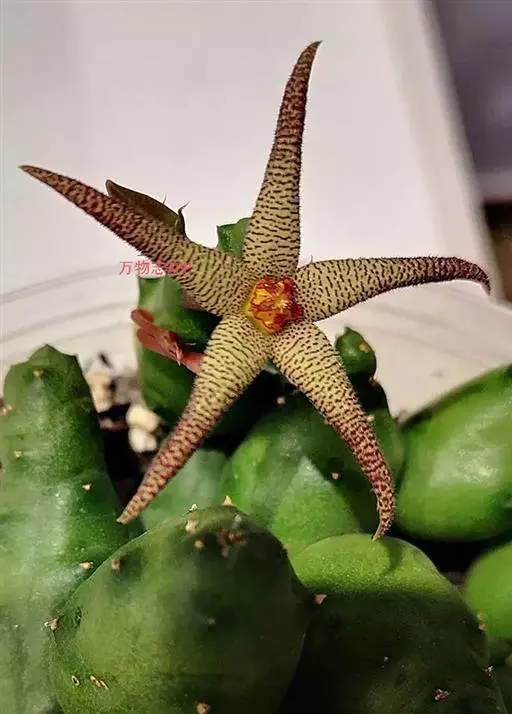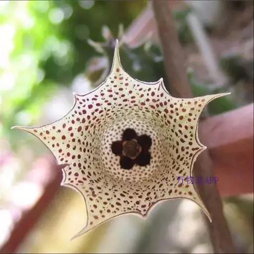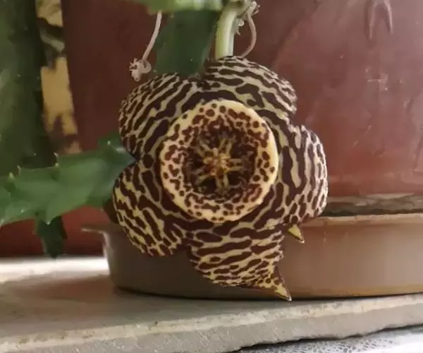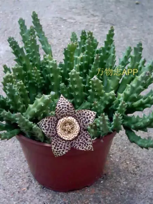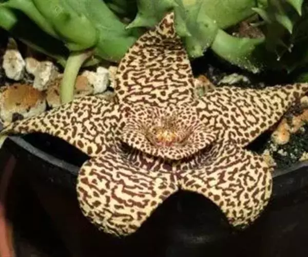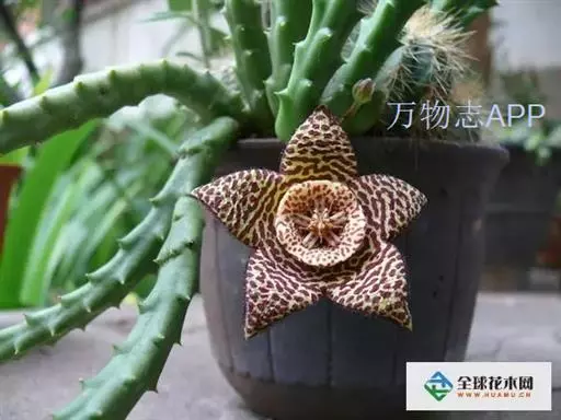 豹皮花又叫犀角,是一种多年生肉质草本植物,是较为理想的室内观赏花卉,豹皮花花期夏秋但不定时,花基生,单生或3朵至4朵并生,花径6厘米至7厘米。花瓣呈五角星状,黄色花瓣,花瓣上有棕色横纹,顶部有一个微型五角星。整个花朵光彩夺目,别具一格,是一种观赏价值很高的花卉。
