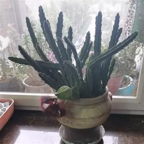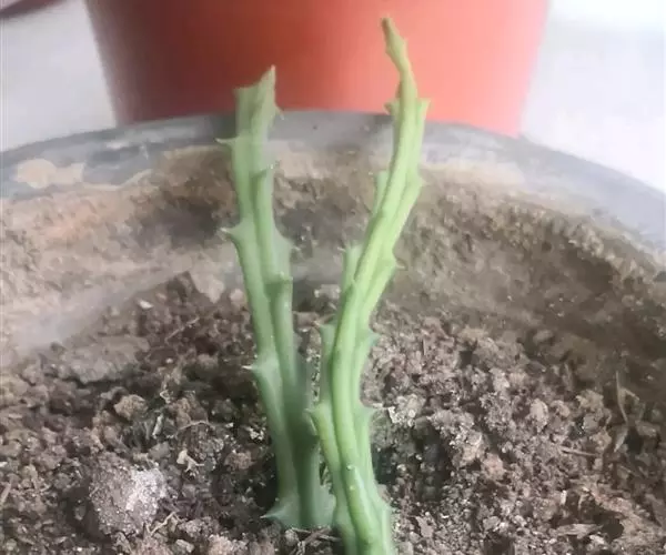 肉质植物,茎亮绿色,几株簇生在一起,高约10厘米,状似仙人掌,四棱,棱稍钝,棱具粗厚软刺,光滑,绿色。无叶。花单生或几个簇生;花梗长2-3厘米;花直径3-5厘米。蓇葖平滑:种子顶端具白色绢质种毛。