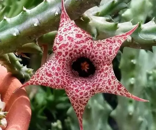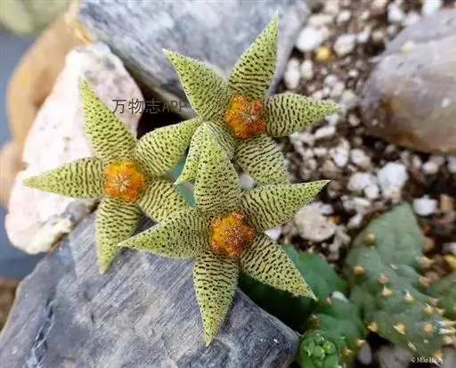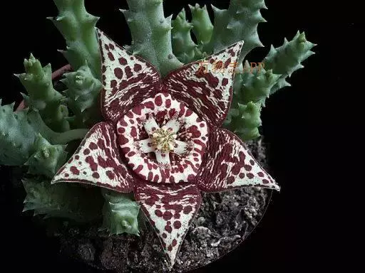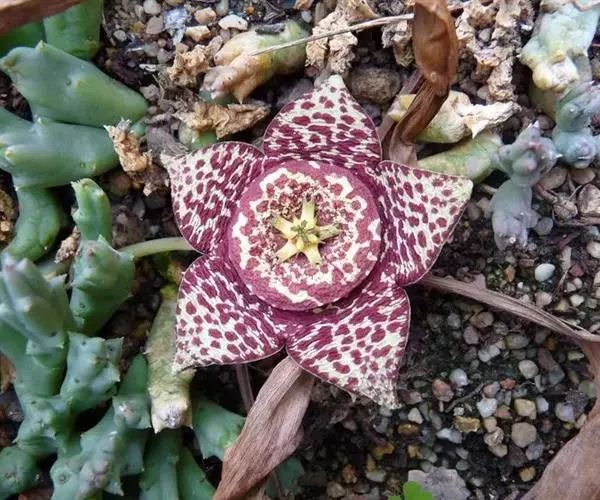 豹皮花株形奇特,五角形的花朵,围绕塔形茎干的基部丛生开放,可作花坛、花园绿化,也可盆栽。