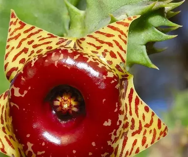 豹皮花像仙人掌,是一种肉质植物,茎呈亮绿色,花单生或数朵簇生;花梗长3-4厘米;花冠五角星状,直径4-6厘米,外面绿色,光滑,内面黄绿色,具暗紫色横条纹及斑点,裂片5,三角状卵形,顶端短尖,边有睫毛。