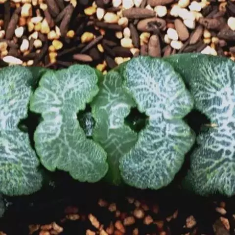 贝叶寿,旧称克里克特寿(H. correcta),学名历经多次变更。植株无茎,肉质叶呈莲座状排列,叶片肥厚、形似贝壳,叶面粗糙、有很小的颗粒状突起,叶色深灰绿、稍透明,有灰白色网纹状线条。松散的总状花序,小花筒形,灰白色,带有深色纵条纹。该种有很多的变化,如窗口纹路就分为无纹、绳纹和网纹。