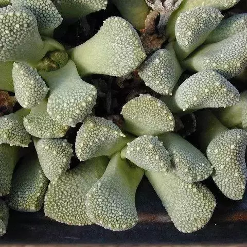 五十铃玉是番杏科窗玉属的多年生肉质植物,别名有“棒叶花”“婴儿脚趾”。植株高5厘米,叶片淡绿色,肉质,…