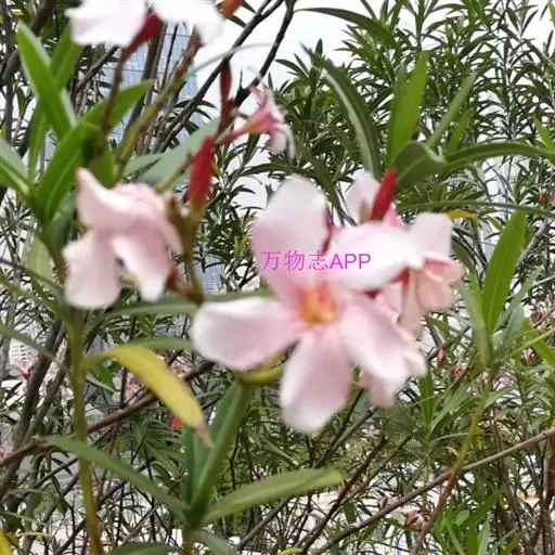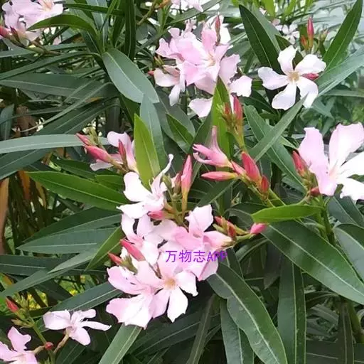 夹竹桃的叶片如柳似竹,红花灼灼,胜似桃花,花冠粉红至深红或白色,有特殊香气,花期为6-10月,是有名的观赏花卉。