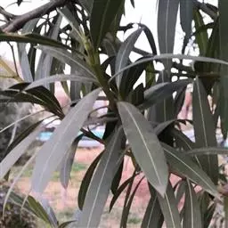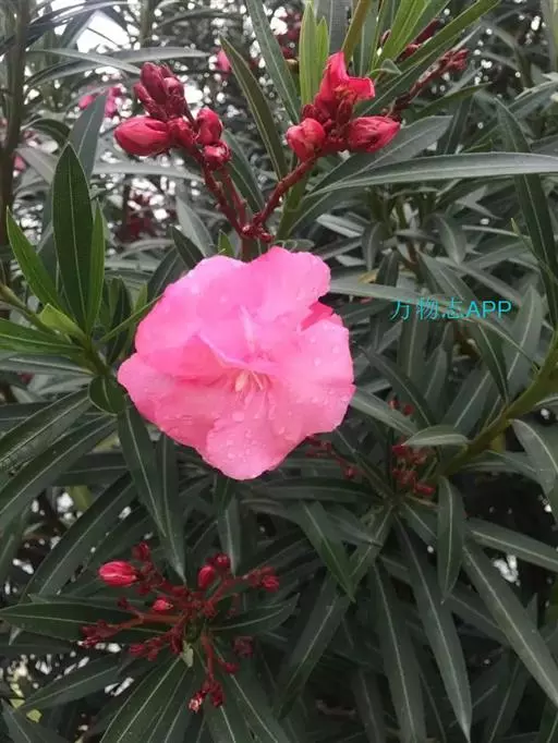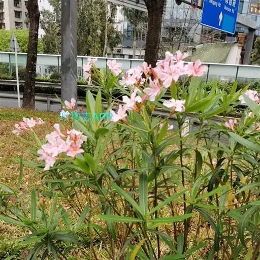 夹竹桃(学名:Nerium oleander L.)夹竹桃族夹竹桃属常绿直立大灌木,高可达5米,枝条灰绿色,嫩枝条具棱,被微毛,老时毛脱落。叶3-4枚轮生,叶面深绿,叶背浅绿色,中脉在叶面陷入,叶柄扁平,聚伞花序顶生,花冠深红色或粉红色,花冠为单瓣呈5裂时,其花冠为漏斗状,种子长圆形,花期几乎全年,夏秋为最盛;果期一般在冬春季,栽培很少结果。