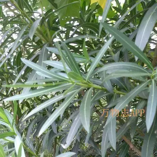 常绿直立大灌木,高达5米,枝条灰绿色,含水液;嫩枝条具棱,被微毛,老时毛脱落。叶3-4枚轮生,下枝为对生,窄披针形,顶端急尖,基部楔形,叶缘反卷,长11-15厘米,宽2-2.5厘米,叶面深绿,无毛,叶背浅绿色,有多数洼点,幼时被疏微毛,老时毛渐脱落;中脉在叶面陷入,在叶背凸起,侧脉两面扁平,纤细,密生而平行,每边达120条,直达叶缘;叶柄扁平,基部稍宽,长5-8毫米,幼时被微毛,老时毛脱落;叶柄内具腺体。