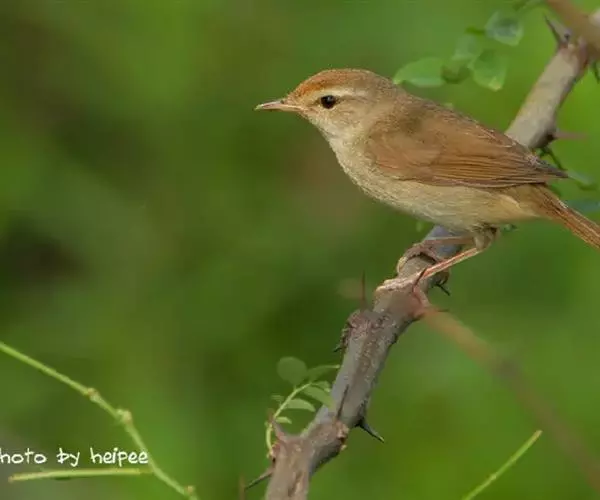 雌鸟比雄鸟小。与厚嘴苇莺的区别在眉纹色淡,体型较小而嘴细,头顶偏红,下体皮黄色较少。与日本树莺易混淆,不同处在于多棕色,下体两胁及尾下覆羽多为暗皮黄色。